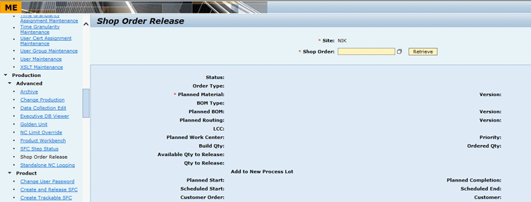 You need to create master data for Materials, Operations, Routings, and BOM. Basic functional knowledge of ME is sufficient for creating this master data. Once master data is created, the first step is to release an SFC to the shop floor at the first operation. SFC is released through the Shop Order Release activity. After operators log in to the system, they can see the list of activities on the left pane (Figure 15).