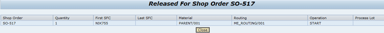 This means that the work on this SFC has been started on the shop floor. An SFC goes through a series of operations that are defined in routing, and once the last operation is completed, the SFC is completed and is ready for delivery. Therefore, releasing an SFC at the first operation means that now work has started on it at the first operation, which is START in this example (Figure 16). In this screen the fields are automatically populated by the system. Click the Close button after viewing this data.