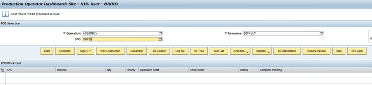 Earlier, when no component was assembled, the script had run and evaluated to true to return the SFC back to ASSEMBLY operation. Therefore, on the screen you only saw that SFC NIK755 was moved back to ASSEMBLY operation. Now, because you have assembled the component, after you click the Complete button on ASSEMBLY operation, you see that a message is displayed on top of Figure 21 that all of SFC NIK755 will be processed at PAINT operation (i.e., SFC is moved to PAINT operation). Now, if you had entered ASSEMBLY against operation and clicked the Start button, the screen would display an error message that SFC is moved to PAINT operation and not at ASSEMBLY operation.