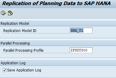 To use your replication model to replicate data from the APO liveCache to HANA, execute transaction code /SAPAPO/REPL. In the screen that appears (Figure 4) enter the name of your replication model in the Replication Model ID field and a suitable profile in the Parallel Processing Profile field. Select the Save Application log indicator and click the execute icon (Figure 4).