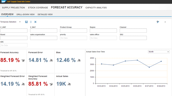 The new add-on Supply Chain Info Center application provides analytics with dashboards and key performance indicators (KPIs) for four dashboard applications: Forecast Accuracy, Supply Projection, Stock Coverage, and Capacity Analysis. It uses Advanced Planning and Optimization (APO), Demand Planning (DP), and Supply Network Planning (SNP) data.