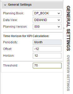 In the General Settings section in the right panel of the screen (Figure 7), you can maintain the Planning Book, Data View, and Planning Version for the various KPI and chart data that is displayed in the Overview screen (the left side of Figure 6). The General Settings section also has a Periodicity setting with periods Offset and Horizon (in this case data displayed in months for the past 12 months) that is considered for the displayed KPI calculation (Figure 6). The Threshold setting highlights the KPI value in red when the calculated KPI value falls below the threshold. For example threshold = 90 means that a forecast accuracy less than the threshold will be highlighted in red.