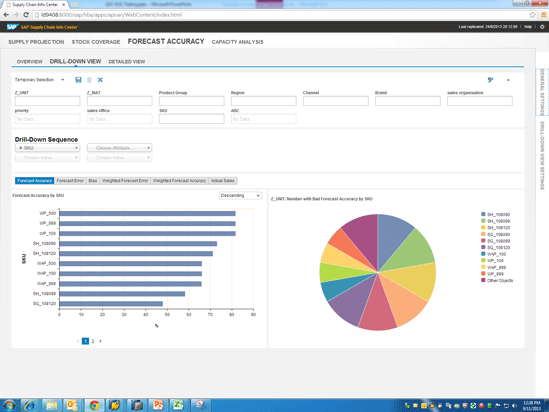 The Drill-Down View (Figure 8) provides a detailed display of a particular attribute (e.g., stock keeping unit [SKU]) for a particular KPI (e.g., Forecast Accuracy). Clicking different KPI buttons changes the drill-down data in this view. It is possible to put selection criteria based on the available attributes such as Product Group, Region, Channel, or Sales Org in the data display selection section. The Drill-Down Sequence (SKU in Figure 8) defines how the different KPI values are sliced down by a maintained characteristic.