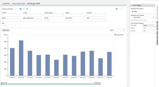 Figure 9 shows the Forecast Accuracy dashboard Detailed View with the actual sales KPI for all products within the last 12 months. Note the slider selection in the x-axis for the time dimension for ease of use. You can also use the Time granularity selection option on the top right corner of the KPI (currently set as Month). It is also possible to switch to a Table View that displays the same bar chart data in a tabular data format.