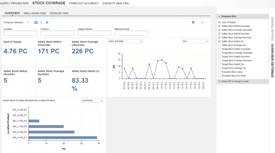 Figure 11 shows an overview of the Stock Coverage application. The available KPIs are different from those used in the Supply Projection dashboard, but are based on the same SNP planning data.