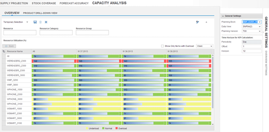 Capacity Analysis is the final Supply Chain Info Center application available in version 1.5 that provides KPIs based on Resource Planning data. Figure 12 shows resource use for all available resources for a given location.