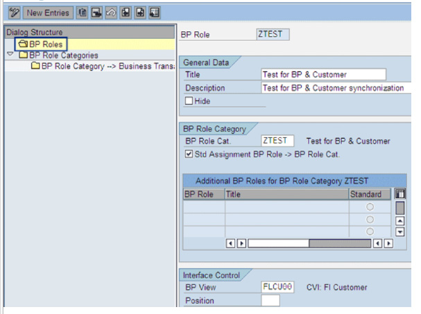 Figure 5. Click on the New Entries button and enter the details. Enter ZTEST in the BP Role Cat. field. The BP View field controls the screen layout of the BP master data maintenance. I recommend entering FLCU00 in the BP View field for customer BP roles. With this BP view, you can maintain BP master data at the company code level.