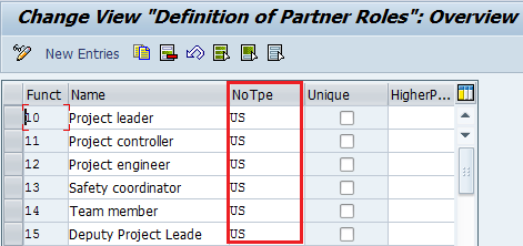 Figure 1 shows the standard SAP transaction to maintain partner roles. This transaction can be found within customizing following menu path project system > Structures > Operative Structures > Work Breakdown Structure (WBS) > Define Partner Determination Procedures and Roles > Definition of Partner Roles or start transaction OPSPAR1 directly. In the NoTpe column, the partner type is visible.