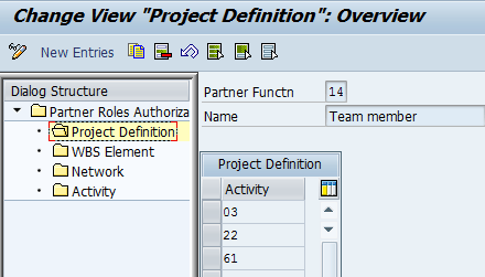 You can define the authorization per partner role. Select a partner role and double-click an object to maintain the authorization. In my example I select 14 Team Member and double-click the Project Definition folder. Figure 3 shows an example of what this configuration looks like for a team member. A team member has authorization for activities 03, 22, and 61. As roles are freely definable, you must define the authorization for all the partner roles you have set up. These are all display activities. Table 1 lists these display activities and explains what they are.