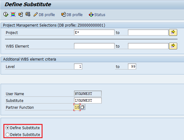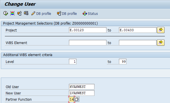 Figure 6 shows an example of this transaction. In this case the team member (partner function 14) KVANWEST is replaced by LVANWEST for selected projects, and because of the inheritance functionality, the replacement of KVANWEST by LVANWEST is also made for the allocated WBS elements.