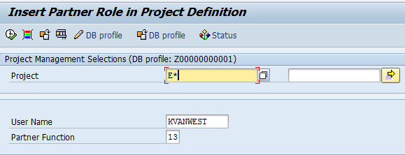 Another example is the possibility to give users in a development environment access to all relevant projects. Figure 7 shows an example of the transaction whereby user ID KVANWEST is added to all projects whose numbers start with E. The partner role is safety coordinator (partner function 13).