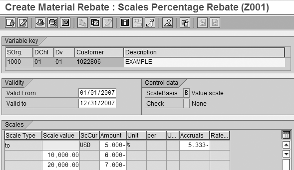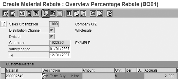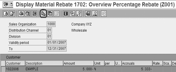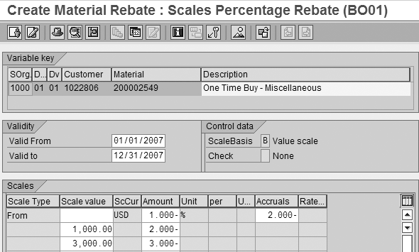 the rebate rate is determined based on sales organization, distribution channel, division, customer, and material. You may