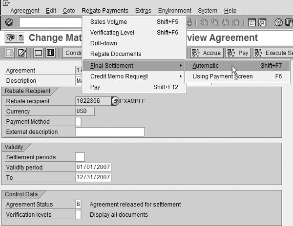 agreement (step 5) and press Enter. Although partial settlements are possible within SD rebate agreements, I discuss a