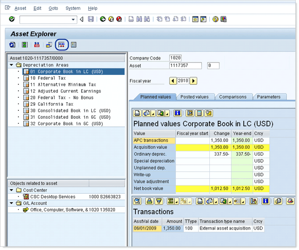 Once you’ve entered the company code and asset number, you can view the asset’s current values, important master data assignments, and planned values into future years. This particular asset is currently depreciating over four years, which yields an annual depreciation of $337.50. To activate the simulation tool, click the simulate icon highlighted in Figure 1 to bring up the screen shown in Figure 2.