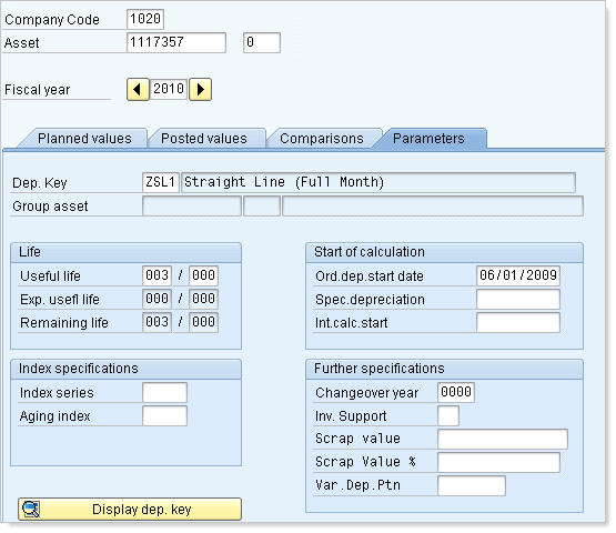 The Parameters tab displays the depreciation parameters that are relevant for the area that you highlighted. Like all the elements on the Asset Explorer, the fields are display only and purely informative. However, with the simulation tool active, you’ll see that most of the fields on the Parameters tab are now open for input. The available fields that you can change are: