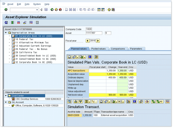 Also notice that the color of the simulated transaction is different from the other transaction that was recorded to the asset. The simulated posting affects the values displayed on both the Planned and Posted values tabs. It’s also possible to combine these two methods – to simulate both a master data change and a transactional posting – without creating any other performance issues. You can also simulate multiple asset postings.