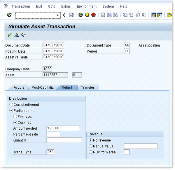 I can now simulate the posting of up to four types of transactions. To simulate the retirement, I click the Retrmt tab and enter the relevant information for that posting, such as the Trans. Type, Partial retrmt, Amount posted, and Revenue settings (Figure 8).