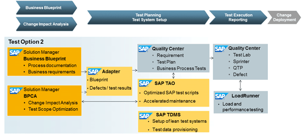 SAP provides various test tool options for test management. Because many companies use SAP Quality Center by HP to manage their test activities, SAP provides a set of integrated products from SAP and HP that allows companies to manage the entire quality process. This set of integrated products and capabilities is positioned as Test Option 2, an offering of SAP and HP apps sold by SAP that includes: