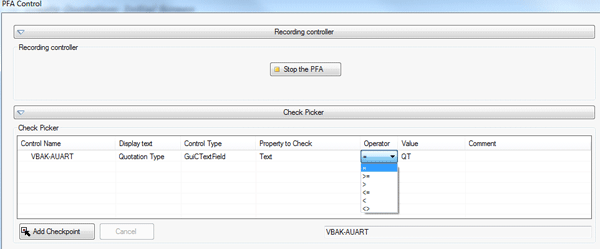 In addition, the user can add checkpoints for screen fields to ensure that predefined conditions are met during test execution. Figure 5 shows a check point for the name of the screen field Quotation Type to ensure that test script execution only passes when creating quotations of type QT.
