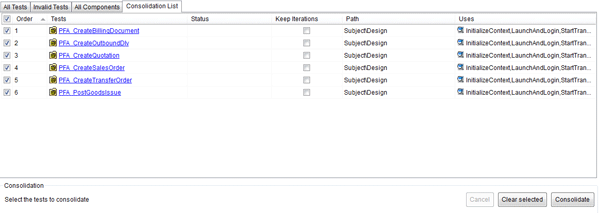 To improve the performance of the test script execution, you should consolidate SAP TAO test scripts by accessing the Consolidation module of SAP TAO (Figure 13). As the result of the consolidation, all components used in a test script are merged into a new consolidated test component and stored in SAP QC BPT.