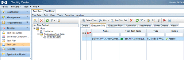 The test script can be executed from SAP QC (Figure 14). In the Test Lab module of SAP Quality Center, a Test Set can be created, and test scripts can be added for execution.