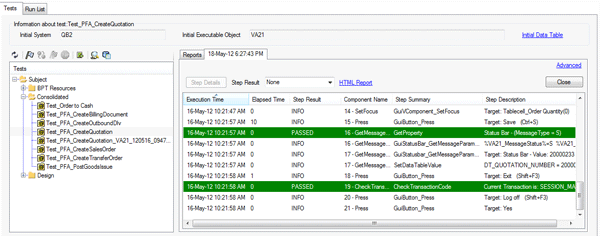 In addition, SAP TAO generates a test execution log that you can access from the Run and Report module of SAP TAO. The user can select a test script and view all the logs generated up to that point by opening SAP TAO after test execution and viewing the detailed reports (Figure 16).