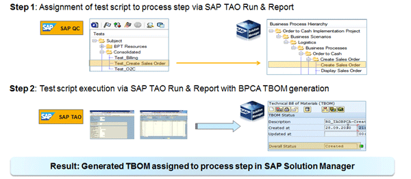 The Business Process Change Analyzer (BPCA) application of SAP Solution Manager helps identify a significantly smaller test scope. BPCA requires the availability of process traces (BPCA TBOM), which you can create manually or through automated tests that SAP TAO provides. After assignment of the test script to the relevant process step, you can execute the test script from Run and Report module of SAP TAO. After test execution, the BPCA TBOM is automatically generated and assigned to the process step in SAP Solution Manager (Figure 17).