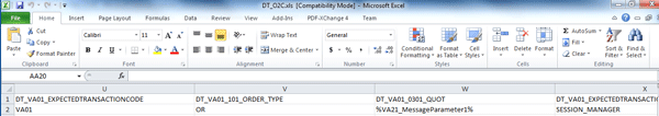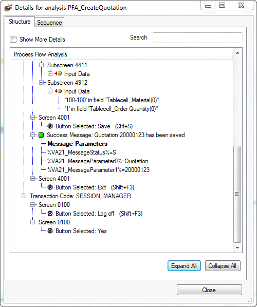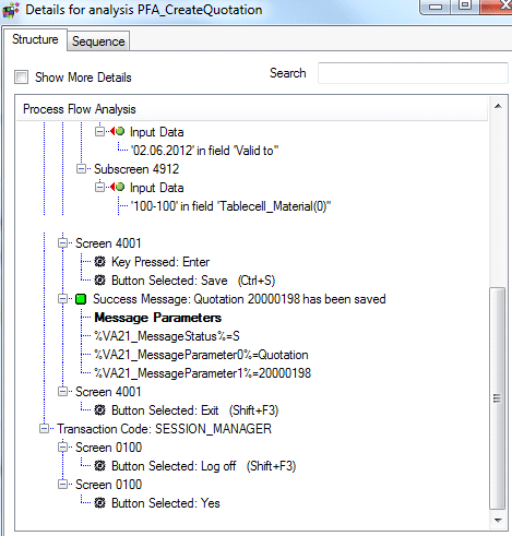 In the O2C example, the quotation number created by test 1 is handed over to test 2, which creates the sales order. The same is true for the subsequent process steps. The document numbers created during each test execution are stored in the SAP TAO execution context. It can be accessed by a special syntax (e.g., %VA21_MessageParameter1%). This value needs to be entered in the required column of the data file. The context parameter is named in the following manner: %<Transaction Code>_MessageParameter<Number>%. The PFA detail report provides the information about the context parameter name that holds the required document number (Figure 20).