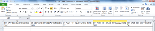 - Component StartTransaction: The parameter SapTransactionCode has parameter value DT_SAPTRANSACTIONCODE, which needs to be modified. For example, for the CreateQuotation (VA21) test script, the new parameter value could be DT_VA21_SAPTRANSACTIONCODE for this parameter. The data file that was created along with the test script needs to be modified. The corresponding column name needs to be updated with a new parameter value name.
