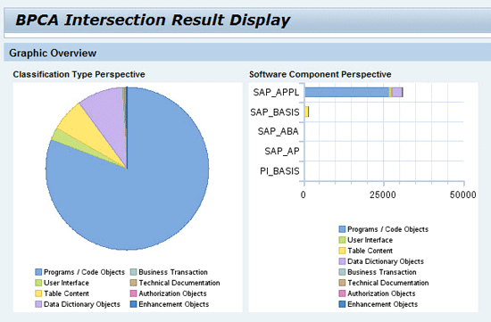 BPCA provides additional graphical and tabular views for change managers who want to investigate the root cause of the effects in more detail. The graphical overview is shown in Figure 3 with affected SAP repository objects classified by type (e.g., programs or code objects), Data Dictionary (DDIC) objects, user interfaces (UI), and table content as well as a breakdown by SAP software component.