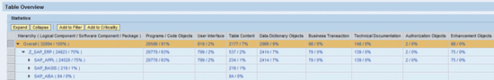 - Table cells: Each cell includes the absolute number of affected objects by system or software component and object type. Relative numbers of changed objects are included via percentages (for example, you calculate 5,000 objects as 25 percent of the total number of changed objects, which might be 20,000, so 25 percent is the relative number). Each table cell includes a link to a detail section that lists all objects with more technical information.