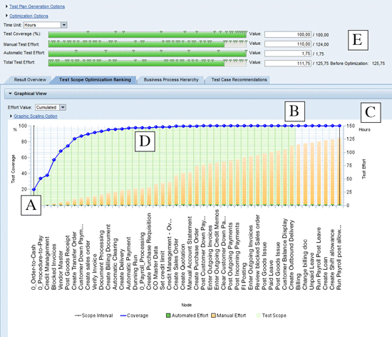 - Point B: The left y-axis shows the test coverage from zero to 100 percent. When the blue curve reaches 100 percent, all changed objects of the change event that affect your business processes have been covered at least once through test cases in the test plan (see the green shaded area of Figure 5).