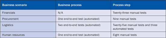 In total, 72 test cases — manual and automated — are assigned at the process step and business process levels (Table 5). Automated end-to-end tests have been assigned to business processes in which single transactions can’t be tested individually. Precursor transactions are needed, creating business documents processed by successor transactions of the end-to-end business process. This is the case for business processes such as order-to-cash and procure-to-pay included in this example.