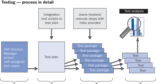 Fortunately, Solution Manager provides an alternative solution to this problem. It helps you organize tests after you’ve defined the business scenarios in the Business Blueprint phase and made initial configurations in the realization phase. Solution Manager not only manages a project’s life cycle, but you can also use it for ongoing maintenance.