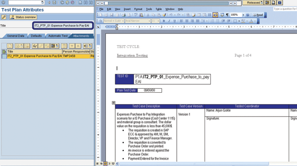 To set up an end-to-end process script, follow menu path Tools > SAP Solution Manager > Test Plan Management. Associate each test plan with a test set to identify whether the test plan belongs to integration test cycle 1 or integration test cycle 2 and so on. Integration testing cycles refer to the testing of test cases belonging to more than one module. For example, when you create a purchase order, the goods receipt belongs to procurement and invoice payables belong to the finance department. These three test cases are tied together to create a test plan. Typically, integration testing cycle 1 tests the SAP system’s functionality and integration testing cycle test 2 tests the SAP system’s functionality and custom development, such as interfaces or user exits (Figure 8).