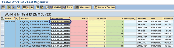 The tester then executes each test. Once the transaction associated with the step is executed, the tester documents the results by clicking the Attachments button (Figure 13). The traffic lights to the right of each step indicate the test results. In this case, the test passed. PTP_01_05 and PTP_01_07 indicate the steps that the tester needs to execute.