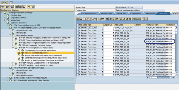 Step 1. Prepare the test cases. First, you need to identify the test cases. This happens when the implementation team gathers the business requirements from the business users. For example, as the project team defines the requirements for purchase requisition approvals, you can see what variations of the approval processes you need to test. One variation could be that when the requisition value exceeds $100,000 the vice-president has to approve the requisition. Another variation could be that if the requisition value is $50,000 the director has to approve the requisition. These variations become the basis for creating test cases. These test cases become clearer at the time of configuration when you configure and unit test the various transactions. You can then identify the transaction and its variations as test cases (Figure 2).