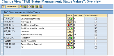 Step 2. Configure Central Test Workbench settings. Use transaction STWB_SET and select Status Definition to set up the testing statuses (Figure 5). You can also use IMG menu path SAP Solution Manager > Configuration > Scenario Specific Settings > Implementation > Testing > Central Setting for Testing > Define Values for Testing > Select Status Definition.