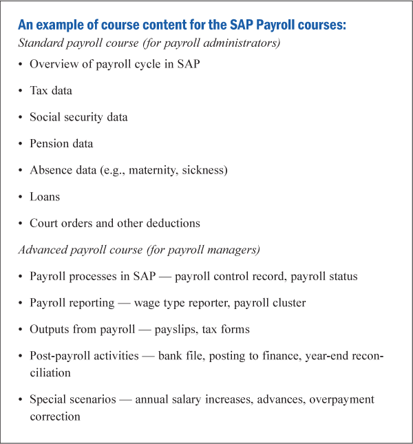 Using the payroll team as an example, if there are two levels of responsibility within the team, it would make sense to split the training of SAP Payroll functionality into two courses (Figure 1). The whole team could attend the first course and those who are responsible for higher-level activities could attend the second.