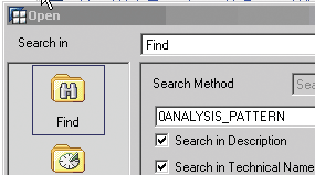 This brings up a dialog box for opening a particular template. In our example, we want to locate the 0ANALYSIS_PATTERN template. Under the Search Method text description, enter 0ANALYSIS_PATTERN and select Search in Description and Search in Technical Name (Figure 1). Click on the Find button. In the results, highlight the template you want and click on the Open button (Figure 2).