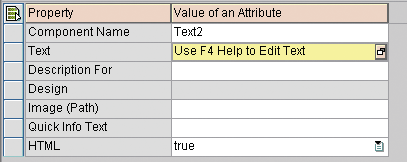 Next, create a new subcomponent by right-clicking on the page and selecting Text, Image, HTML. Assign a name to the subcomponent and then click on Ok. Finally, click in the Text field to display text and select the Use F4 Help to Edit Text option (Figure 7). Enter the simple HTML code shown in Figure 6. To make sure the text subcomponent displays as HTML, change the HTML option in Figure 7 to true.