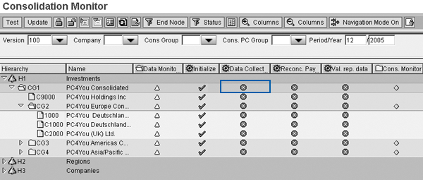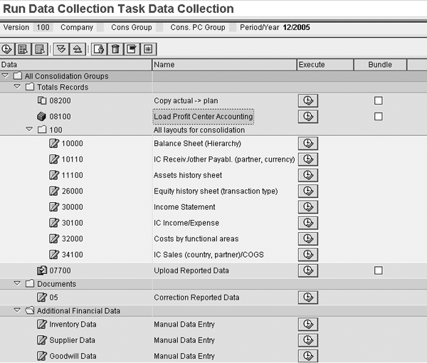 You now need to assign the tasks to the Hierarchy in Figure 9 so that you can execute these activities from the consolidation monitor. Use the consolidation Hierarchy tab and expand the task list. The Data Collection tab is available for you to execute. It holds a number of data collection processes, as you can see on Figure 10. You navigate to Figure 10 by clicking on the circled field in Figure 9. In my example, I am uploading Profit Center Accounting data from the Profit Center Accounting InfoCube. Upon execution of this method, the system copies the uploaded data automatically from InfoProvider Z0PCA_C01 to totals InfoCube 0BCS_C11, so it is available for the additional consolidation activities.