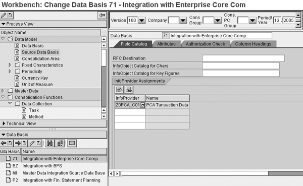 Moving to the screen shown in Figure 5, you can see the creation of the Source Data Basis 71. It is linked with the InfoProvider Z0PCA_C01, which contains the necessary data for the consolidations process. In the Field Catalog tab, you can see that the RFC Destination is empty, which confirms that the aforementioned InfoProvider is located in the underlying BW system. In addition to this tab, a series of additional informational items is available to establish parameters for your consolidation process. You can use these items, such as attributes and authorization checks, in one of the other requirements for Sarbanes-Oxley compliance — internal controls of business rules and access to specific characteristic values.