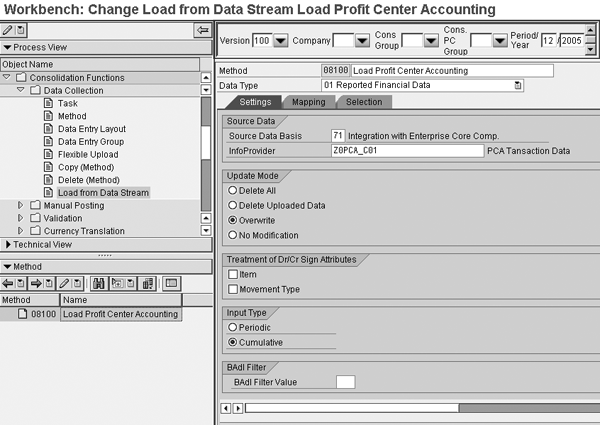 Once you have created these structures, you develop a data collection method. Go to the consolidation workbench via Process View>Consolidation Functions>Data Collection>Load from Data Stream. Enter the source data basis and the specific InfoProvider that you assigned to this source into the appropriate fields (Figure 6).