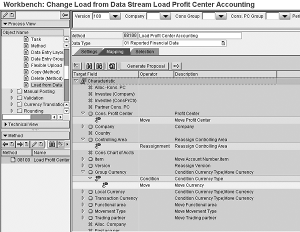 You then assign the Method to the Task (data collection – 1000) on the Workbench: Change Task 1000 – Data Collection screen. The number 1000 is the technical name I assigned to the data collection process. The initial Method used in Data Transfer consists of other methods, which are shown on the right side of the screen in Figure 8, with the method 08100 chosen for a specific group of postings to be transferred. With the assignment of the Data Stream, you then assign the task to the Consolidations process in the Workbench screen. Scroll down on the screen shown in Figure 8, and click on Task. Then attach the Method. This allows you to execute the task from the consolidation monitor screen in Figure 9.