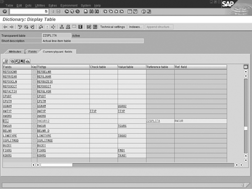 2. Assign a receiver field of RWCUR for field WSL. This can only be done in the data dictionary transaction, SE11. Enter the line-item table and click on the display button. Go to the Currency/quant. fields tab. Scroll down to the WSL field at the end of the list, as shown in Figure 3. Enter the line-item table as the reference table and RWCUR as the reference field. Save and activate the table.