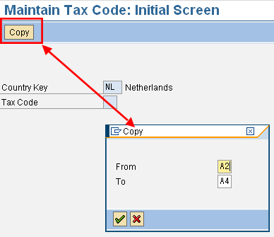 In Figure 1, enter the country key for the tax country and then click the Copy button. In the pop-up screen that appears enter the old tax code in the From field and the new tax code in the To field. Press Enter or click the green check icon.