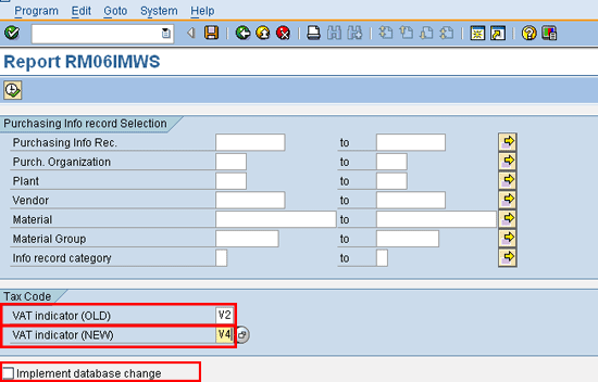 Start transaction SA38 (or SE38) and enter the report name RM06IMWS. Click the execute icon to advance to the selection screen of the report (Figure 10). You need to enter the old and new VAT codes. When you don’t set the indicator called Implement database change, the report produces an overview of only the information records to be changed. When the indicator has been set, the information records are updated.