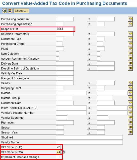 A similar report exists for the update of purchase orders and similar documents, such as contracts. Report RM06ENMW changes the old VAT code to the new VAT code. Figure 11 shows the selection screen of report RM06ENMW. The Scope of List field determines what information is to be displayed. By default, it is set to BEST. You also need to enter the old and the new VAT codes. When you don’t set the indicator called Implement Database Change, the report produces only an overview of the information records to be changed. When the indicator has been set, the selected purchase documents are updated.