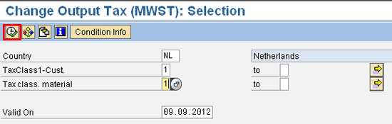 Now press Enter. In the next screen that appears (Figure 12) enter the country code, tax classification for the customer, tax classification for the material, and a date to select the condition valid on this date. The tax classifications are used to indicate whether a customer is liable for VAT and the rate that should be applied (high, low, or medium).